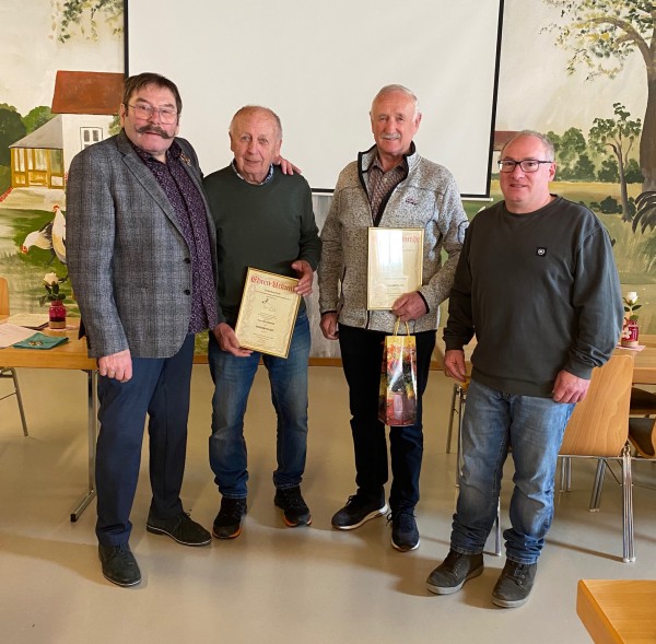Die neuen Ehrenmitglieder Rudolf Hauptfleisch (2.v.r.) und Walter Ebinger (3.v.r.) mit dem 2. Vors. Jens Bauer und dem Vors. Ewald Dietz (l.).